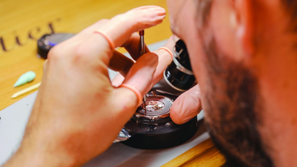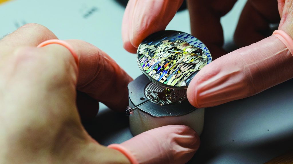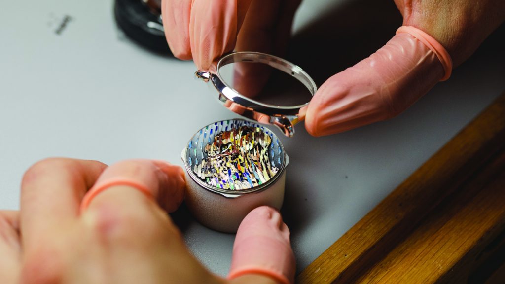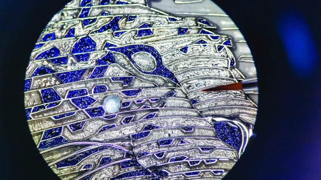 A microscope is required to enable the miniature details of the dial to be perfected. Each piece requires more than a hundred hours of work, 97 of which are exclusively for the dial.