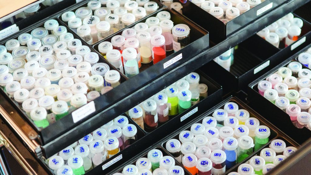 Drawers contain 500 colours of powder used to create the enamel elements on the dial. For this piece, six hues were employed to bring the panther’s eyes and black spots to life.