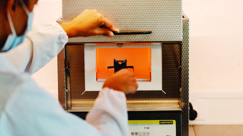 To secure the enamel in place on the dial, it must first be fired in a kiln at around 800 degrees Celcius. The temperature is then adjusted to obtain the correct colourations for each of the separate enamel settings. It must be cooked ten times to achieve the final result.