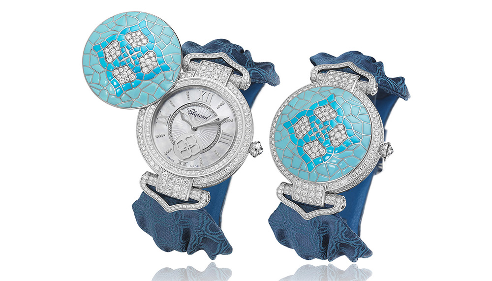 Though separated by thousands of miles, these Pre-Columbine civilisations shared a common aesthetic of mosaic decorations. They weren’t the originators, of course, but they were equal to the royal artisans of Rome and Persia. Using mainly turquoise shards applied to a wooden base, they created ceremonial masks, historical chronicles and divine depictions, including priceless artefacts like the double-headed Aztec serpent at the British museum. It is this custom that Chopard co-opts for this secret watch.
