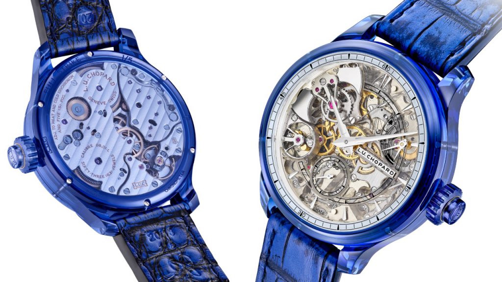 Scheufele declined to elaborate if versions in other colours would appear in subsequent years (“I’m not going to tell you that,” he said, laughing), but did acknowledge that sapphire crystal can be created in several hues (hint, hint). “It’s a very complicated process,” says Scheufele. The material is not only difficult to machine but is further complicated when colour is added due to the difficulty in getting of achieving uniformity. “All sapphire crystal is Swiss-made,” he adds. “This is part of our philosophy. We won’t go for anything else.”