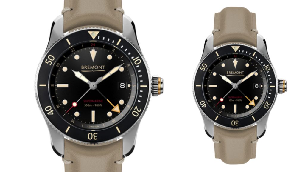At 40 mm in size, the S302, like all of the professional dive watches in Bremont’s Supermarine Type 300 range, is slightly smaller than its bulkier cohorts. It’s also more vintage-looking, borrowing an aesthetic from its predecessor, the S301, but with the added bonus of GMT functionality, expressed by the burnt orange GMT hand and the 24-hour markers seen around the model’s dial ring. The new Sahara Vintage leather strap paired with the black dial completes the model’s refined yet retro look.