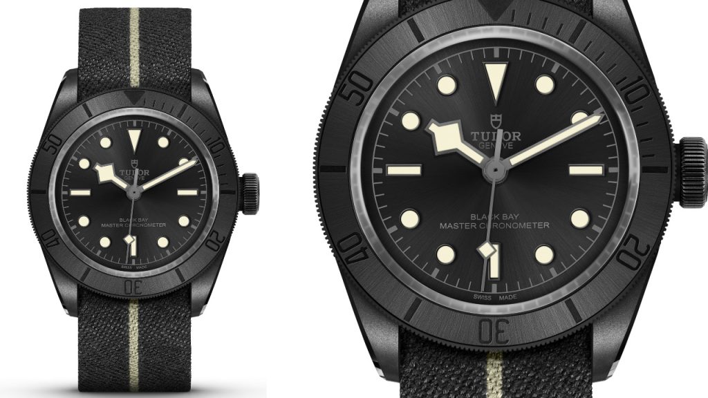 Tudor’s new Black Bay Ceramic boasts not one, but two highly regarded certifications: The model’s Manufacture Calibre MT5602-1U is certified by the Swiss Official Chronometer Testing Institute (COSC) and the watch comes with a Master Chronometer certification from METAS, meaning it’s able to function within a 5-second range of variation each day (0 +5), as opposed to COSC’s slightly less stringent standards (-4 +6). Technical attributes aside, the 41 mm model is a study in stealthy good looks. Encased in sleek matte black ceramic, it bears sand-blasted surfaces with sharp, beveled edges and a striking mirror-polished façade. The piece comes on a hybrid leather and rubber strap (black, natch), as well as a complimentary black fabric strap with a cream band.