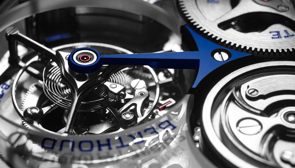 The Chronomètre FB 1 features a dial made from satin-brushed, silver-colored brass, with a blue subdial at 12 o’clock that displays the time — though seconds are marked by a long central hand. This style of offset construction is meant to recall the super accurate marine chronometers that explorers like Malaspina used on their ships to assist with navigation. The power reserve indicator appears at 9 o’clock, while an elongated aperture at 6 o’clock reveals the timepiece’s tourbillon.