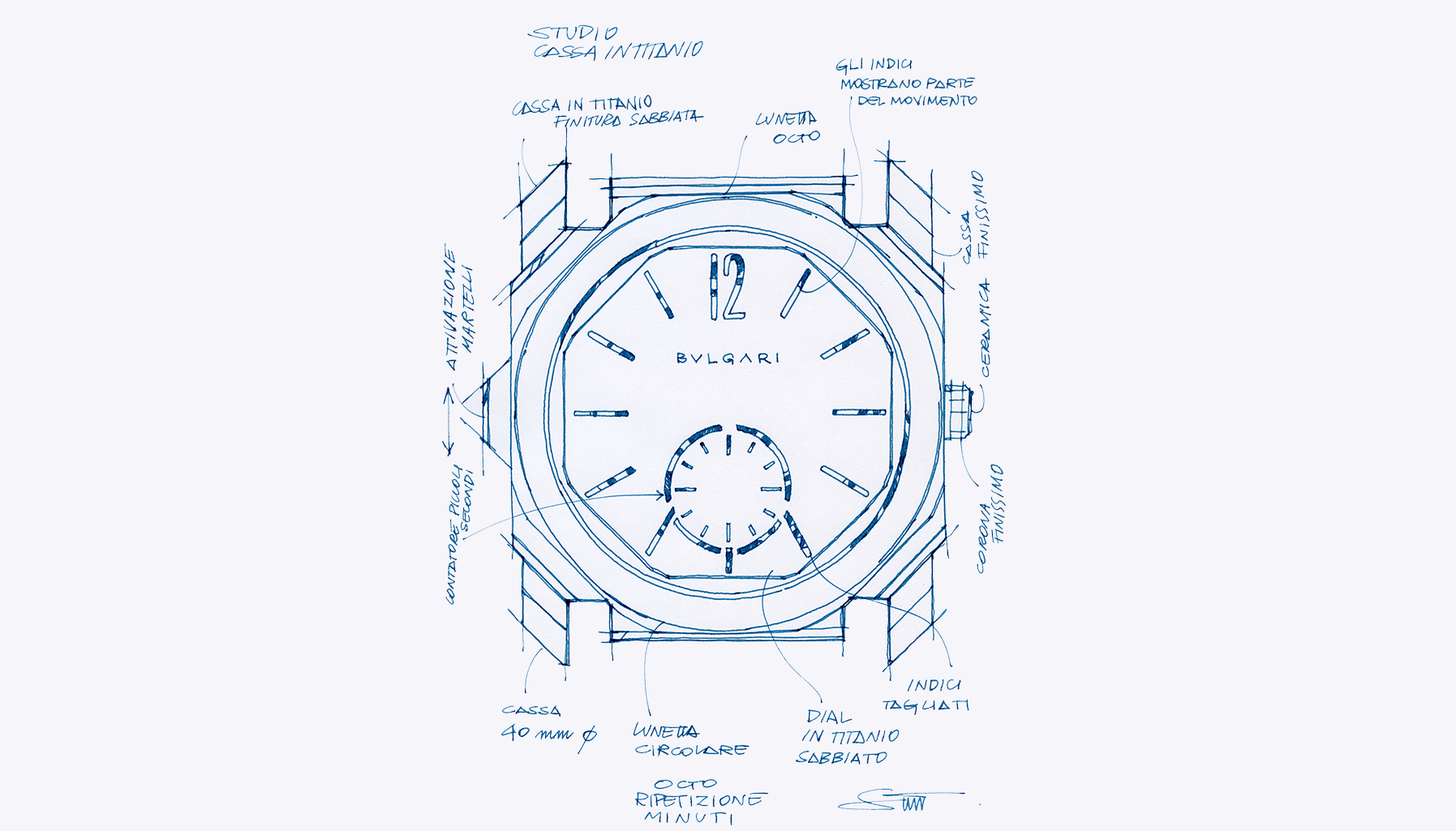 The Gerald Genta influence is a delicate topic because when we created the first Octo in 2002, Genta was no longer working with Bulgari. The idea was to help the design evolve so it fits with the story of the brand while still respecting its beginnings. Bulgari has always loved working with geometric elements and playing with very pure forms, so that’s what we did. Notice the symmetry of the Octo’s case (eightsided and unmistakably a Gerald Genta legacy) and how the double-layer bezel stands out from it – we have managed to play with different geometric elements of the design to come up with new shapes.