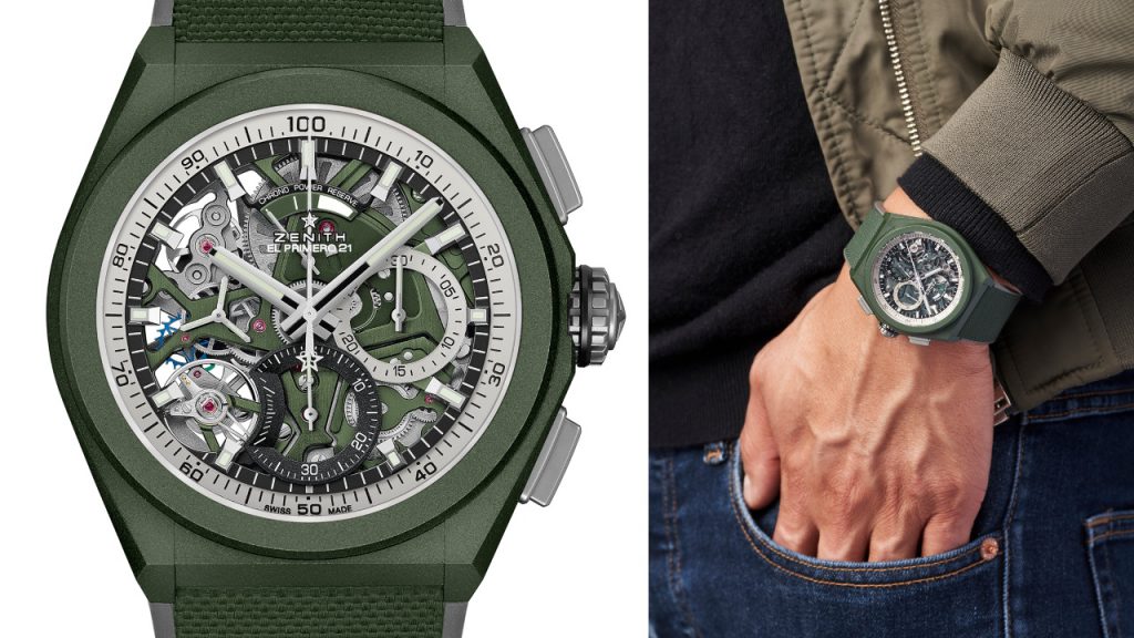 Green watches have become increasingly popular. Whether military-inspired or not, they make a nice style statement for increasingly casual wardrobes. Zenith hopped on the bandwagon with its latest Zenith Defy 21, aptly called the “Urban Jungle,” both for its striking leafy hue and its modern construction. It marks the first time the Swiss watchmaker has dressed the model in green ceramic and it comes with a matching rubber insert, with grey edges, that uses a cordura-effect to create the look of a Nato strap without using fabric.