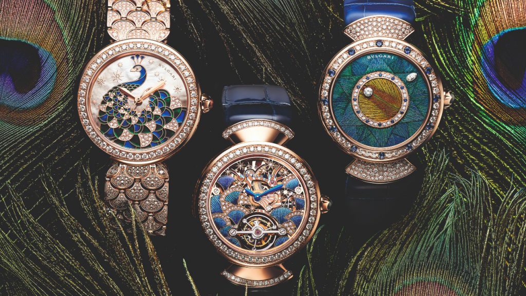 Bulgari’s Diva’s Dream collection consistently serves up high-end complication pieces for women as a tribute to history’s grandest dames. The latest offering is no exception. The new Peacock line, which comprises three timepieces, has that signature pop of color and artfully combines diamonds and ancient techniques in an undeniably alluring way.