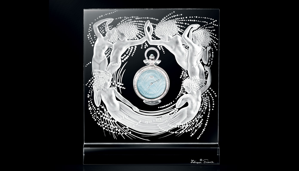 A recess in the centre of the case – where the clock was originally placed – now accommodates a 55mm Parmigiani pocket watch. Crafted from 950 platinum, the PF355 movement manual-winding timepiece evokes the same aquatic motifs as the case. From the front, a whirlpool of bubbles spread across the 18k gold and Grand Feu enamel blue dial. From the back, Arethusa herself is seen; her face framed by two fish in masque de femme style, embellished with, what else, Lalique crystals. The watch itself may be removed from the table clock configuration to be worn with a platinum chain.