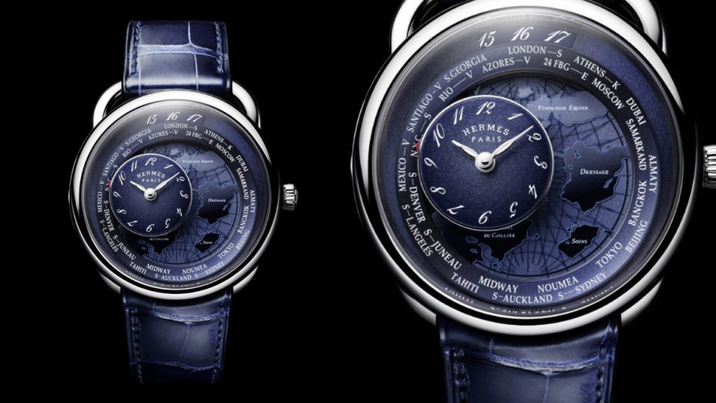 A poetically executed yet practical timepiece, the Arceau Le Temps Voyageur is a two-time zone watch featuring a mobile time display that circles the dial when the user sets the local time. Set against an artful depiction of a world map, the watch’s time display literally traverses the globe along with its owner.
