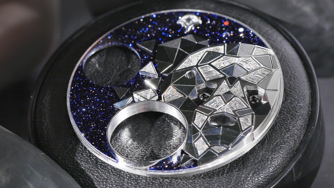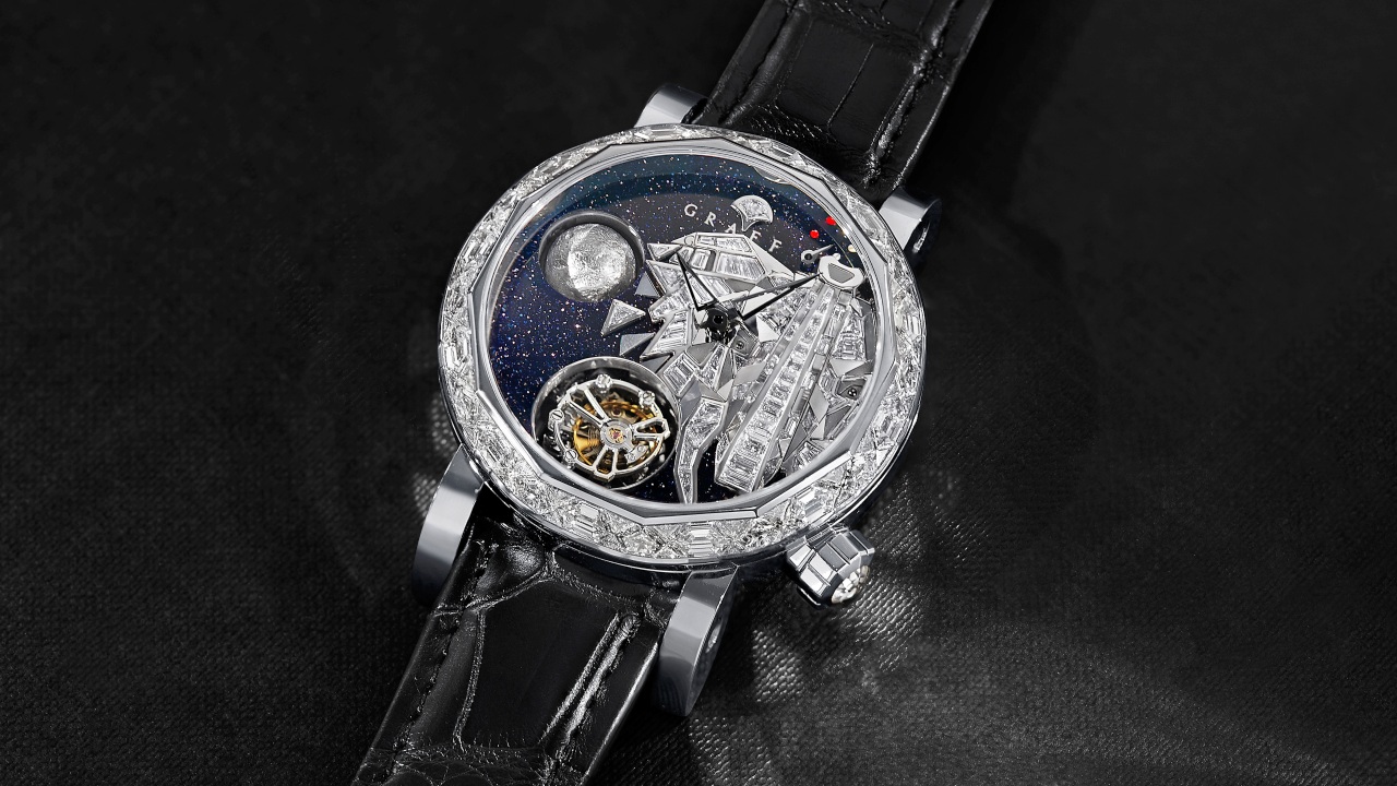 As a blank slate, the Graff Gyrograff is an impressive enough statement piece. The case is a hefty 48mm in diameter, usually studded with diamonds, and it sports some impressive complications: a double-axis tourbillon, and a hand-carved white-gold moonphase indicator, realistic down to the craters. Together, they are quite the three-dimensional visual treat. But that is only the start for the Gyrograff, as the expansive dial is usually a work of art on its own. Past models depict scenes that can veer quite whimsical: cityscapes and world maps to race cars and galaxies, crafted with long-time technique such as gem-setting, enamelling and micro-painting. Needless to say, the level of finishing is what one would expect from a maison known for its exquisite high jewellery.