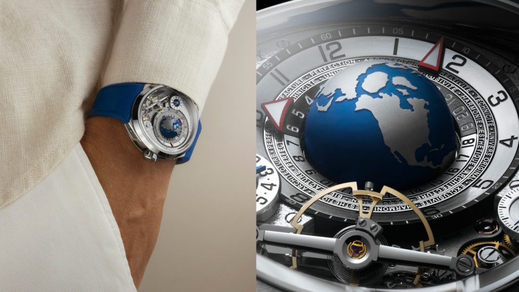 Priced at a (mere) US$400,000 (about RM1.8 million) on a rubber strap or US$445,000 (just over RM2 million) on a titanium bracelet and housed in a 46.5 mm convex titanium case, the GMT Balancier Convexe shares with its discontinued predecessor a dial bearing a rotating, three-dimensional globe, the defining feature of the model, if not of the brand itself. But this new version, which features the globe at center as well as a balance wheel inclined by 30 degrees (instead of a tourbillon), boasts a design described by CEO Antonio Calce as “more cool, more pure, more clean.”