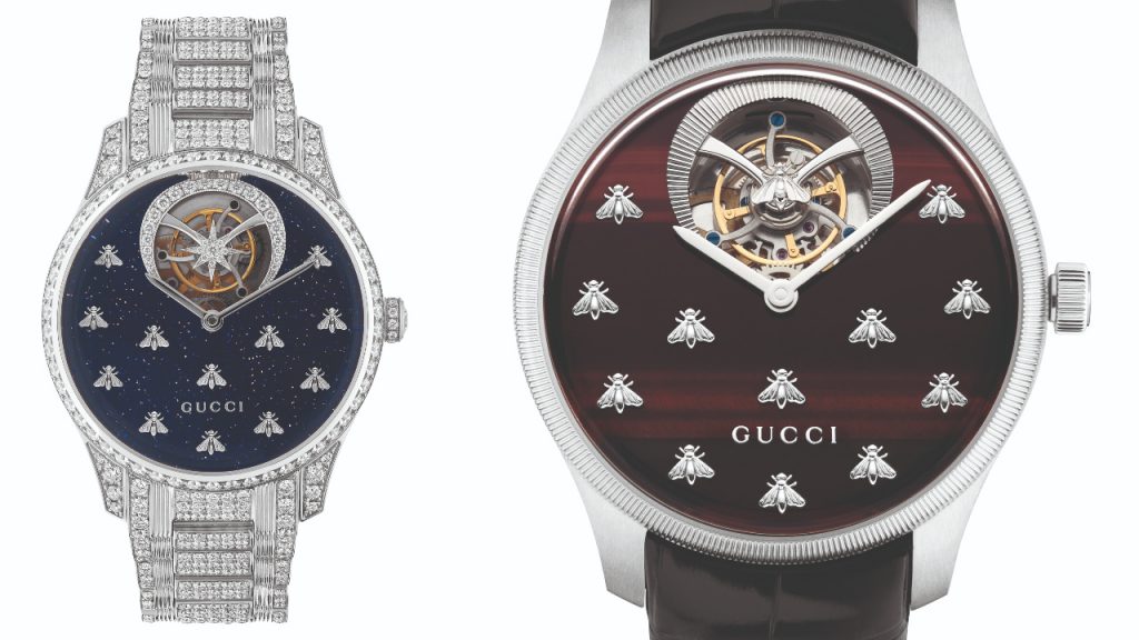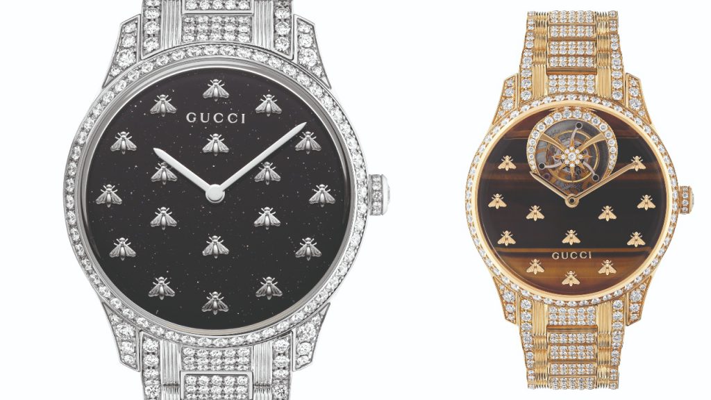 The collections, which include everything from tourbillons and jumping-hour movements to fully gem-set pieces and sapphire-crystal constructions, are assembled in Switzerland’s watchmaking mecca in La Chaux-de-Fonds at the Kering watch manufacture. Dials are crafted in the Gucci-owned Fabbrica Quadranti facility in the Canton of Ticino in Besazio, Switzerland. The design is conceived in Neuchâtel, Switzerland, where Gucci houses its watch headquarters. The company’s first “in-house” movements are featured in the 25H (in all models) and G-Timeless Dancing Bees (in the tourbillons) collections.