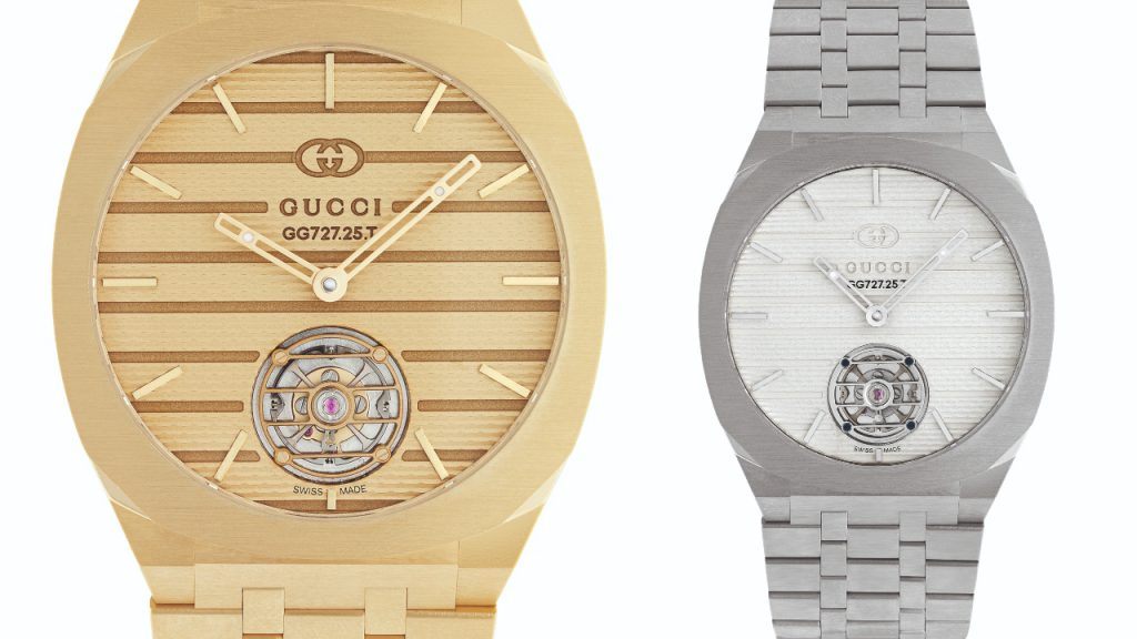 Diamonds and stone dials aren’t for everyone, so Gucci included a few straightforward timepieces in the collection. The sporty 25H range, named after Michele’s favorite numbers, comes in ultra-slim automatic time-only steel models (€8,200 for steel or €10,500 for steel with a diamond-set bezel or approximately RM41,000 and RM52,000) or two tourbillon versions in platinum (€170,000 or approximately RM845,000) or yellow gold (€120,000 or about RM597,000).