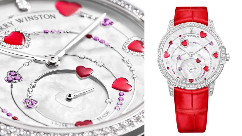This 2021 piece from Harry Winston’s Midnight collection is animated by dancing hearts and powered by an automatic Swiss movement visible through its sapphire crystal case-back. The hearts are made of cabochon mother-of-pearl with 56 diamonds, 24 pink sapphires, seven rubies and white gold cabochons to confer an unmistakable romance on the 36mm white gold watch. This piece is completed by a red alligator strap and fitted with an 18K white gold ardillon buckle, and is limited to a mere 14 pieces worldwide.