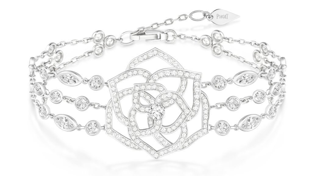 The rose and diamond, two enduring representations of love, combine in one spectacular result with this bracelet in 18k white gold. A trio of white gold chains adorned with diamonds leads to the central display, that of a rose burnished by the fire of 181 brilliany-cut diamonds (approx. 2.17 carats) and four marquise-cut diamonds (approx. 0.61 carats)