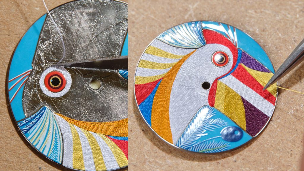 Each Toucan de Paradis dial is composed of 500 individually assembled threads and takes a full week to execute. The white-gold base is first enameled, and the artisan uses a very fine brush to coat it with glass powders mixed with natural oils, which are then applied in several layers, dried and fired in the kiln. Recesses are engraved around the enameled surfaces to house the silk thread, and then the weaving begins. Each thread is meticulously positioned and fixed into place to create just the right reflection of light and the perfect weave.