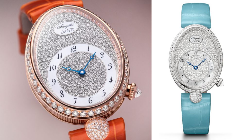 The Reine de Naples was inspired by a Breguet piece made in 1812 for Caroline Murat, the Queen of Naples and sister of Napoleon Bonaparte, and historians believe it was the first wristwatch ever made. The modern collection was launched in 2001, with signature elements that include the egg-shaped case like the original, as well as a coin-edge caseband, off-center crown and decorated dial. This diamond dial is snow-set, with varying sizes of diamonds that, when placed on the dial, allow for a tighter fit, thus covering more of the surface. The result is pure dazzle. Bezel, flange, lugs and crown are also diamond-set, for a total of three carats. The latest 8938 version is available in white gold with a blue bracelet or in rose gold with an orange bracelet, and both come with a chapter ring set in mother-of-pearl. More information here.