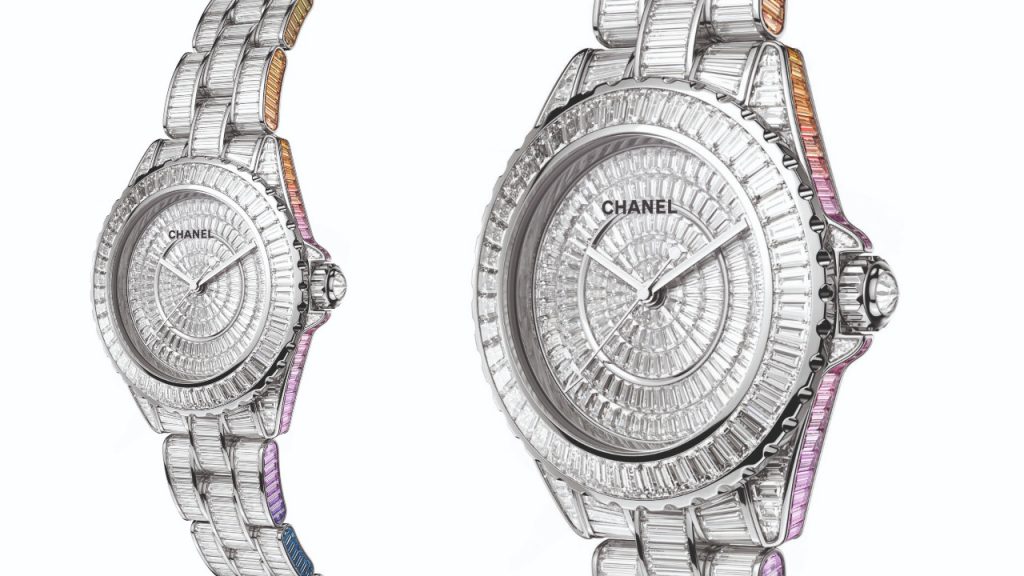 Chanel added sapphires in a rainbow of colours to its collections this year, in a look inspired by the world of Electro music culture, which Arnaud Chastaingt, director of Chanel’s watchmaking creation studio, describes as “a radical, eccentric visual universe, reflecting the nightlife and atmosphere in which it evolved.” This is the high jewellery watch in the Electro lineup, with a case and bracelet lined on the outer edges by a discreet rim of rainbow sapphires. In total, the 38 mm watch is adorned with 578 baguette diamonds totaling 32.55 carats and 26 baguette rainbow sapphires weighing 13.01 carats set in 18-karat white gold. It is limited to just 12 pieces. More information here.