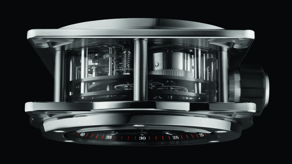 Originally inspired by the Meccano construction system, the Meca-10 table clock employs the same skeletonised structure as its wristwatch counterpart for an unparalleled view of its inner workings. The spatial configuration also lends itself to a greater appreciation of its layers of fine mechanics. Measuring 7.7 inches by 7.1 inches (about 19.6 cm by 18 cm), its case comes in two versions: one angular take with a ring of polished satin-finished steel and transparent composite, and a second covered with black PVD and the bridges supporting the gear trains are also coated in black.
