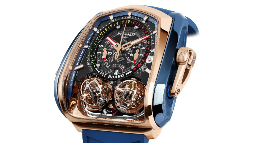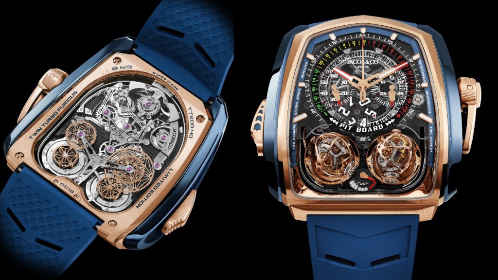 The original Twin Turbo Furious was launched back in 2016 at Baselworld and was recognised as the first timepiece in history to combine two triple-axis tourbillions and a minute repeater, according to World Tempus. Jacob & Co. incorporated the pit board into the Twin Turbo models to bring them closer to the design of hypercars and to offer collectors an easy way to compare two elapsed times, and it’s still the stand-out feature today.