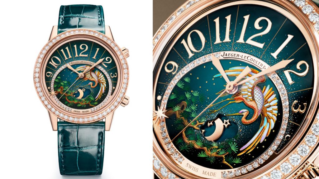 The timepieces showcase three artisanal areas of JLC’s expertise: lacquer work, miniature painting and gem setting. The highlight is the Koi edition, whose black dial features the bright orange Japanese fish taking a dip into the blue rippling water of a pond just beneath a weeping willow tree. Peeping through the sky in the centre of the scene is the day/night indication. The Koi fish is said to symbolise “strength of purpose, courage and perseverance in the face of adversity, bringing the rewards of success, abundance and good fortune” according to the company.