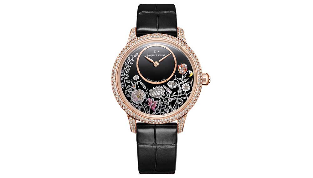 The Jaquet Droz Petite Heure Minute Thousand Year Lights timepiece is a celebration of beautiful flowers and beautiful women. Unveiled at Baselworld 2016 and limited to only 28 pieces, the ladies watch uses an unusual, unique technique in its craft. Mined from the techniques of the Korean Goryeo dynasty, the Najeon Chilgi method is used to encrust mother-of-pearl in lacquer. The black lacquer dial is used as a representation of the night sky, on which delicate lacquered flowers of mother-of-pearl shine in pearlescent. The technique involves careful application of mother-of-pearl, lacquered then polished with utmost care to give a luminescent surface. Paint is then applied carefully by hand to yield a nocturnal landscape of gleaming blooms.