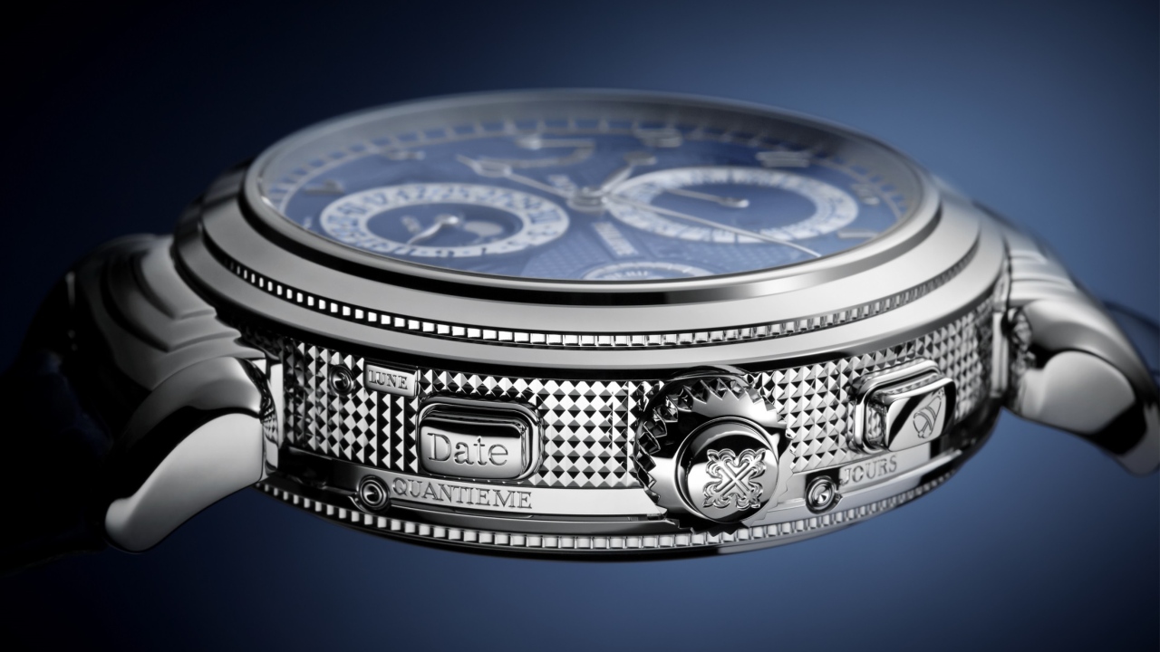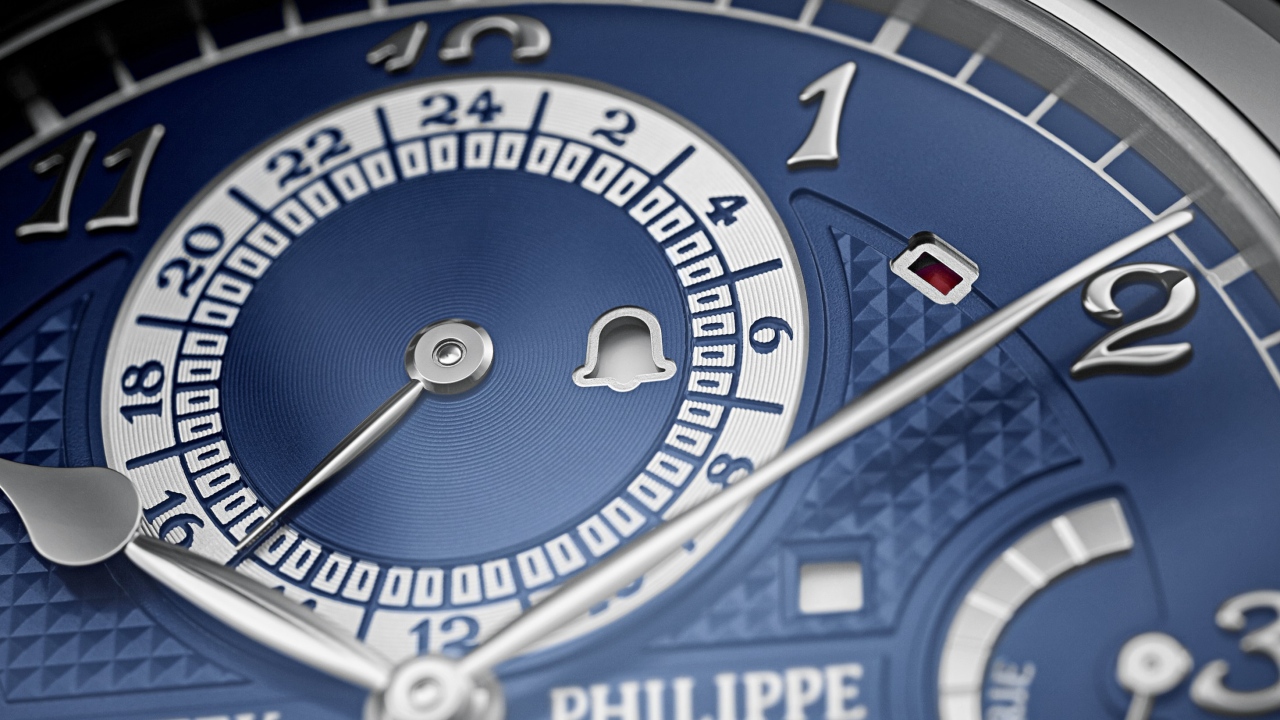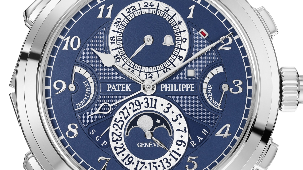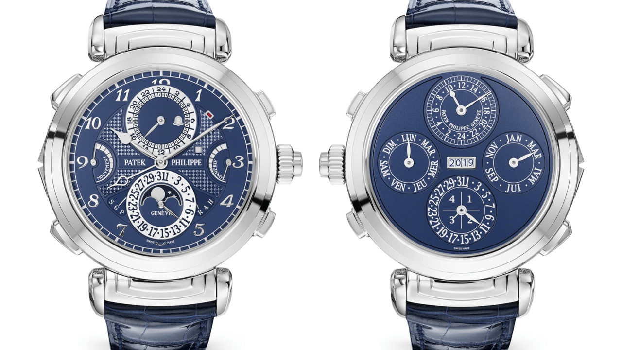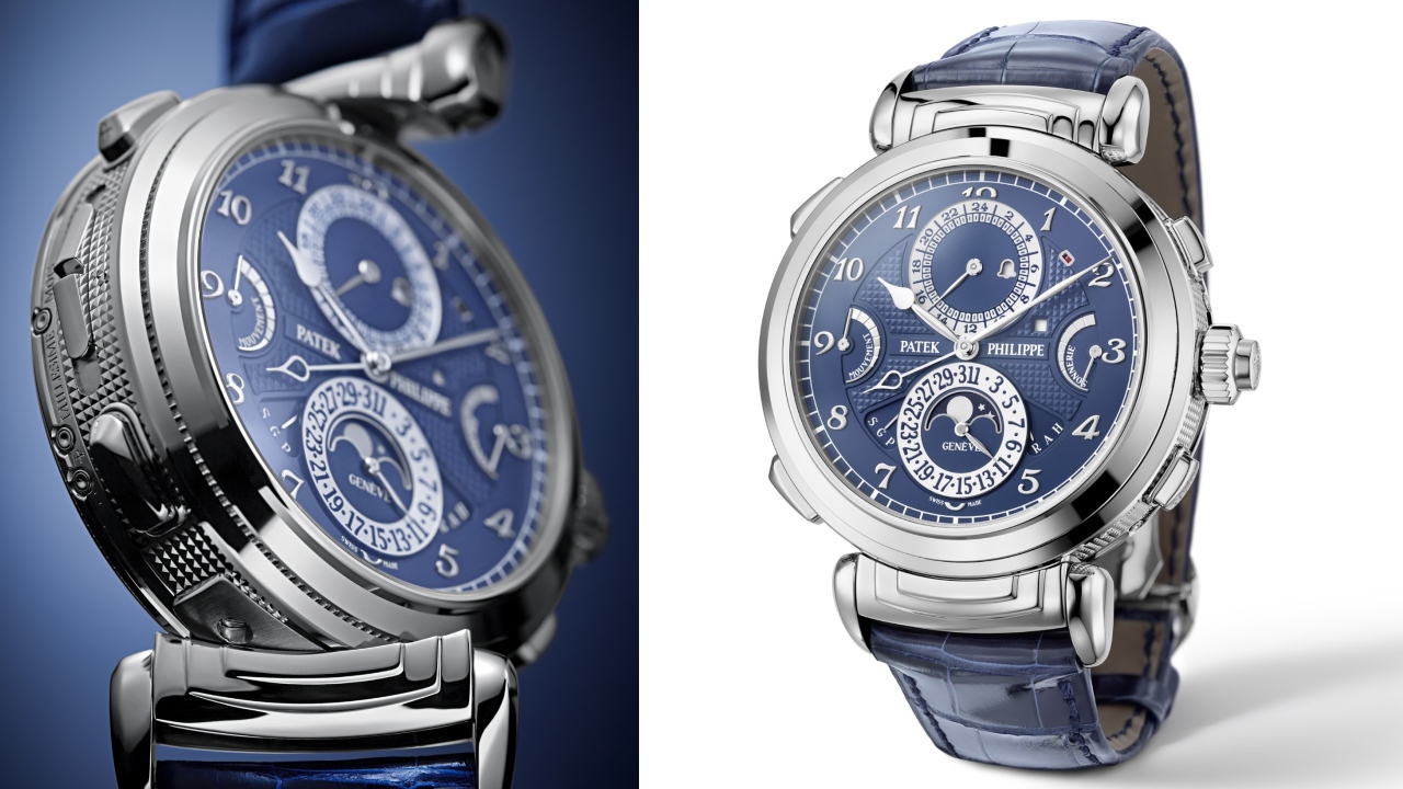 The model Jay-Z was photographed wearing is the second iteration of the original ref. 5175, which was released as part of Patek Philippe’s 175th-anniversary collection. It remains the most technically complex timepiece the iconic watchmaker has ever produced, replete with 20 complications spread across the reversible case’s two dials. Among them are five chiming functions, a moonphase indicator and a second time zone. The version in this particular case has a beautiful white gold case in place of the original’s yellow gold one and elegant black and white dials. The version below features a blue dial.