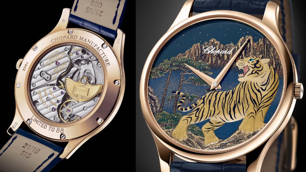 This year sees yet another Chinese zodiac-themed watch from Chopard boasting of an urushi lacquer dial decorated with the gold maki-e highlights. These are ancient Japanese arts, and each of the 88 examples of the L.U.C XP Urushi Year of the Tiger have been through the workshops of the century-old company Yamada Heiando. The scene is of a tiger in its characteristic powerful stance, with an intricate background of a bay and surrounding cliffs. Chopard’s elegant XP case is offered here in ethically sourced rose gold, 39.5mm in diameter and just 6.8mm thick. It houses a self-winding movement with a 65-hour power reserve. Retails for RM105,860.
