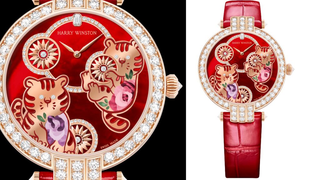 Harry Winston’s entry is much more playful, with the dial featuring two cartoon tiger cubs rendered in rose gold, with stripes filled in with red beaded mother-of-pearl and diamonds for eyes. It is also the first time the rosette motif – three of them, to be exact, crafted out of rose gold and with a diamond at the centre – is found on a Harry Winston timepiece, taken from the wrought iron gates of the maison’s flagship store on Fifth Avenue. The 36mm rose gold case is set with 57 diamonds, while the red alligator strap features a further 17 on the buckle. It is limited to just eight pieces.