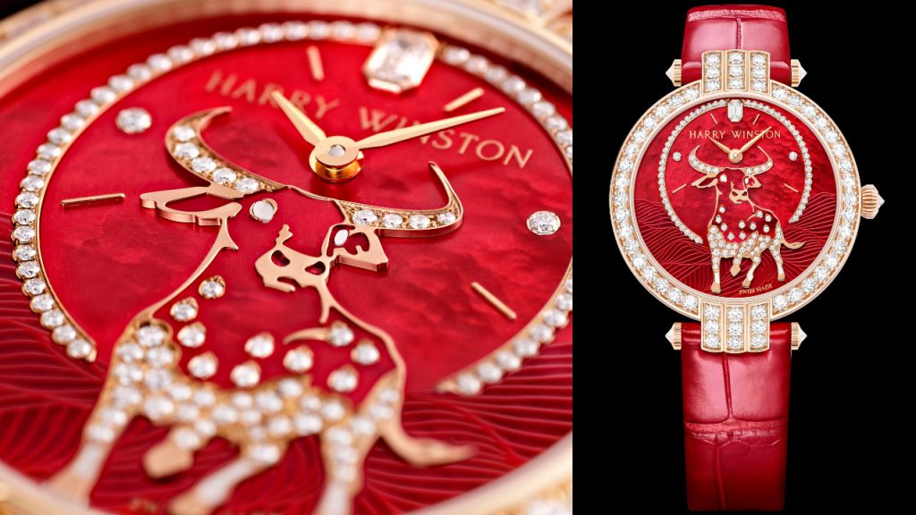Limited to just eight auspicious pieces, this delicate offering from Harry Winston includes 57 diamonds on the rose gold case and 106 on the dial. The ox is depicted through a realistic silhouette outline of rose gold and highlighted with diamonds; this is applied on a red mother-of-pearl dial that lends depth and iridescence. The lower section of the dial bears a wave-like pattern inspired by the rolling landscapes of traditional Chinese paintings.