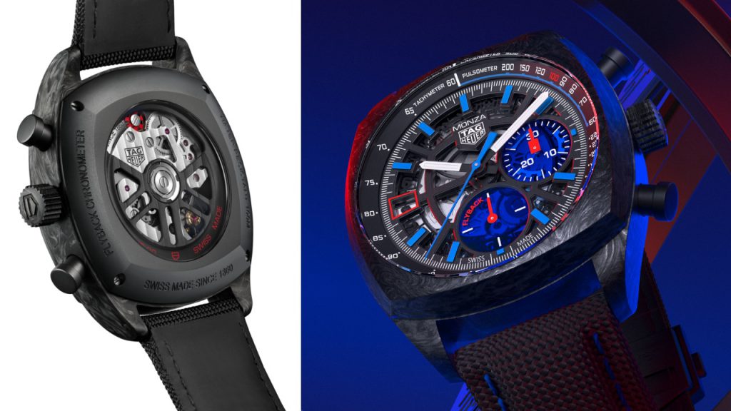 The new TAG Heuer Carrera 60th Anniversary is for fans of the brand’s history, but the Monza Flyback Chronometer (RM56,500), on the other hand, may reference its 1970s roots albeit with a thoroughly modern make-up. It has a 42mm carbon case with black DLC-coated pushers and crown to match, and wears surprisingly easily despite its broad-shouldered profile. The dial is open-worked, while the minutes totaliser and running seconds sub-dials are translucent blue sapphire. The hour markers are blue as well, filled with lume that also glows a bright blue in the dark. The overall look is unabashedly sporty, with a hint of motorsports aggression. The Calibre Heuer 02 COSC Flyback, a self-winding COSC-certified flyback chronograph movement, from the Autavia collection also returns. The bezel has pulsometer markings for its first quarter, marked by a blue line and calibrated to 15 beats, while the rest of it acts as a tachymeter. A black textile strap with blue stitching completes it.