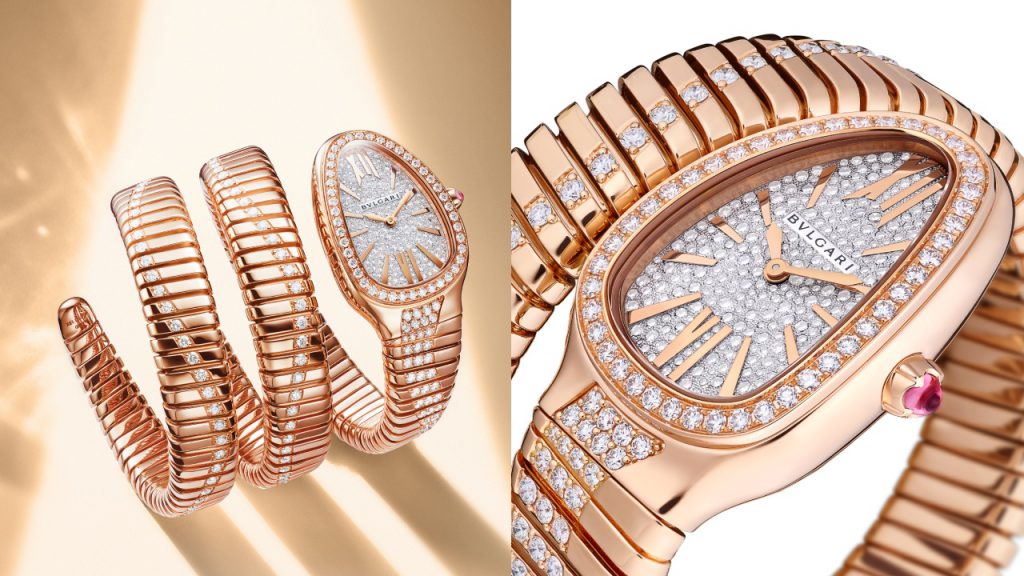 Bulgari focused on its traditional strengths, with a dazzling, vibrantly coloured display of bejewelled ladies’ watches. Not quite so colourful but more intriguing on a technical basis was the Serpenti Tubogas Infinity. At first glance, it seems very similar to the pre-existing Serpenti Tubogas – a Bulgari icon with its snake-head watch on a plumbing-inspired bracelet – save the inlaid diamonds that undulate along its length. Its gem-set nature was made possible by re-engineering the bracelet entirely, with each gold segment constructed separately and assembled on a titanium blade in a way that sacrifices none of the suppleness and comfort that one expects of the Roman jeweller. Equipped with high-precision quartz movements, it comes in single- and double-twirl varieties (RM268,000 and RM347,000 respectively); the latter has 486 diamonds across bracelet, case, and dial, for a total of 5.85 carats.