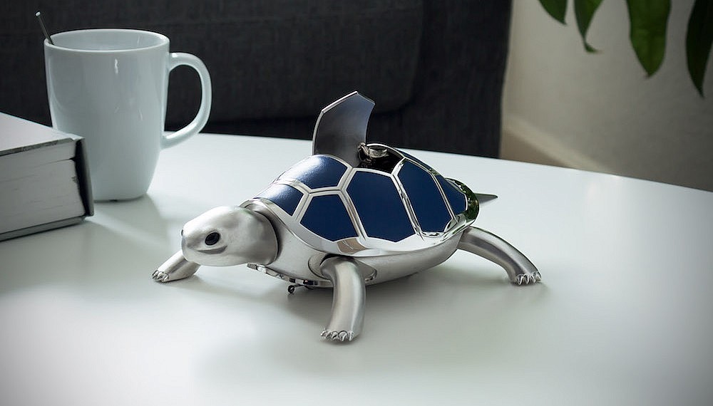 Kelys is a 24cm long, 1.4kg rhodium-plated brass torstoise with a shell set with 12 leather scales that come in one of four colours. Turn a key on the belly to wind up the mainspring, and Kelys begins moving — walking, to be exact, with a gait that mimics that of a real turtle. Simple in concept, but a formidable mechanical problem, eventually solved with the wizardry of elliptical gears and cams. As if that was not impressive enough, Kelys has a built-in friction clutch system that will stop the automaton from walking off a table edge.