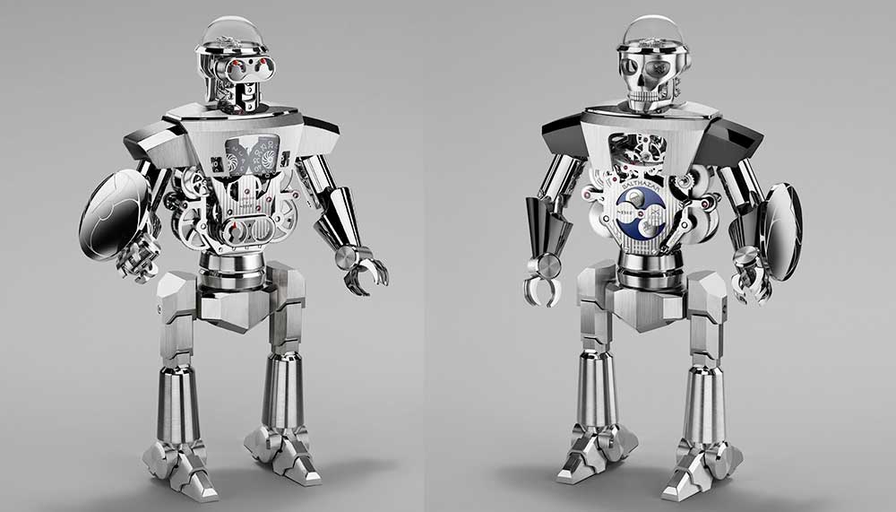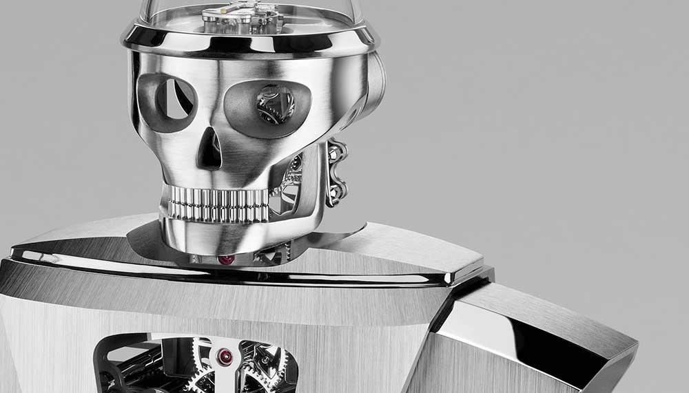 While Sherman looks happy and carefree, the new Balthazar is more terrifying. Balthazar is built by MB&F’s perennial partner, Swiss clockmaker L’Epée 1839, as a ‘high-precision robot clock displaying jumping hours and retrograde seconds, with a 35-day power reserve.’ Composed of 618 micro-engineered components, Balthazar usually shows his ‘nice’ side to the world, a face with a smile whose eyes serve as 20-second retrograde counters, as well as jump-hour and continuous minute discs on its chest. But Balthazar has a dark side, which you can reveal by twisting him at the waist, unleashing a scowling skull face and a body where a dual-hemisphere moonphase indicator sits.