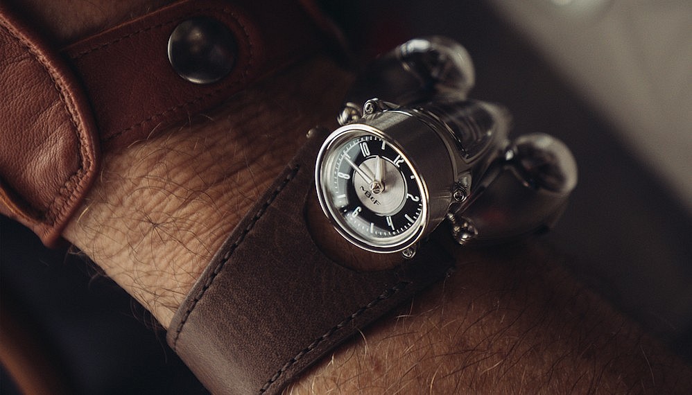 And the latest machine to roll out of the brand’s studio might just be its wildest creation yet. The HM9 Flow, which MB&F founder Max Büsser kept a carefully guarded secret during this year’s Baselworld, has finally been unveiled after three years of development — and it looks like a spaceship for the wrist. The design has a distinctly retro-futuristic vibe. It actually takes aesthetic cues from the curvilinear forms of ’40s and ’50s airplanes and cars — specifically the Mercedes-Benz W196, the 1948 Buick Streamliner, and the round-nosed De Havilland Venom aircraft first created in 1951 by the Royal Air Force and last used by the Swiss Air Force until 1983.