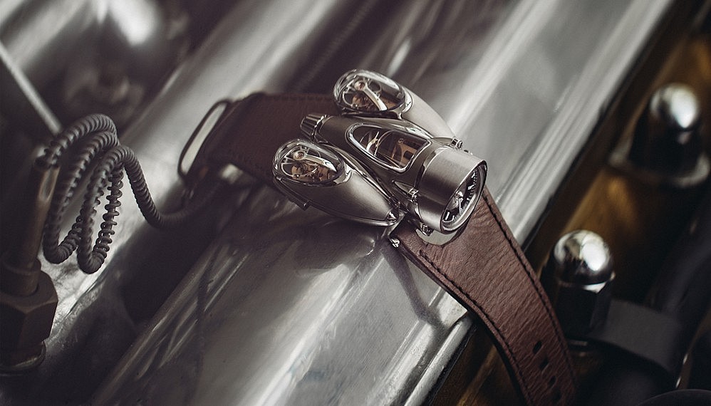 The watch tells time sideways, like other timepieces built to be worn at the wheel, so that the face of the timepiece can be read vertically at the side of the wrist instead of on top of the wrist. The “engines” of the titanium-cased machine house two balance wheels that beat at 2.5 Hz beneath two aerodynamic sapphire-crystal domes that flank the main body of the machine. In the central body, a third sapphire crystal dome reveals the gearbox that averages the output of both balance wheels to provide the reading of the time. The crown is located on the central body on the opposite side of the watch’s dial.