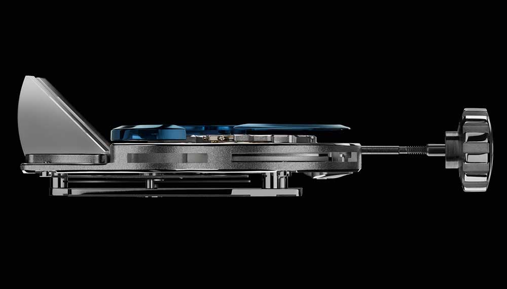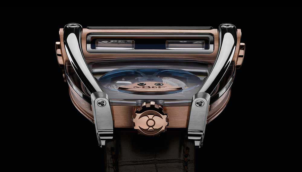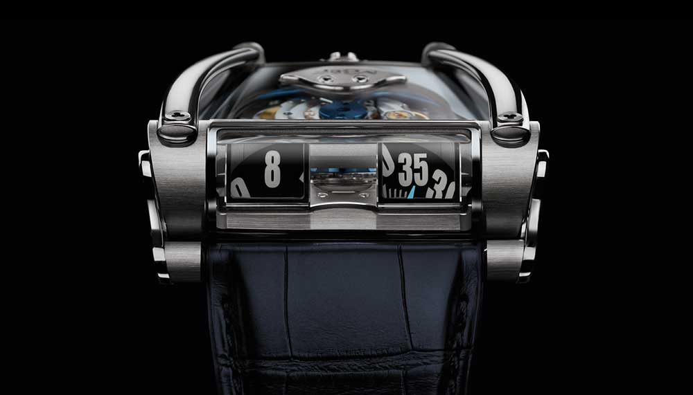 The Sowind base movement that powers HM8 has been modified to accommodate an in-house module containing two discs that display the bi-directional jumping hours and trailing minutes through two wedge-shaped sapphire crystal prisms. Considerable expertise was required to manufacture the crystals, which are designed to reflect light rather than refract it. A convex lens at the front magnifies the indications.