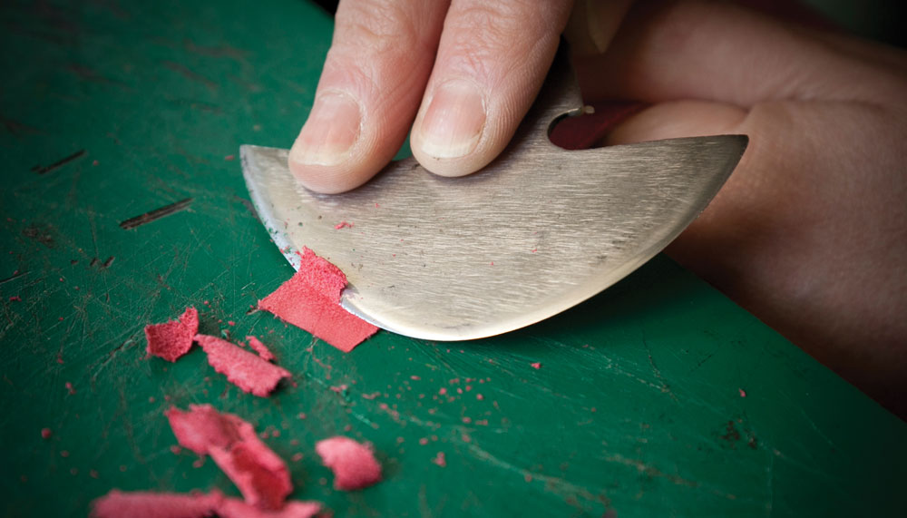 In the modest workshop behind her house, ancient tools and materials are still being used. There are the clams – wooden clamps that resemble large tweezers, which are held between the craftsman’s legs and keep the leather in place and at the right height for the craftsman’s hands – the vintage leathers and the traditional hand-waxed linen threads.