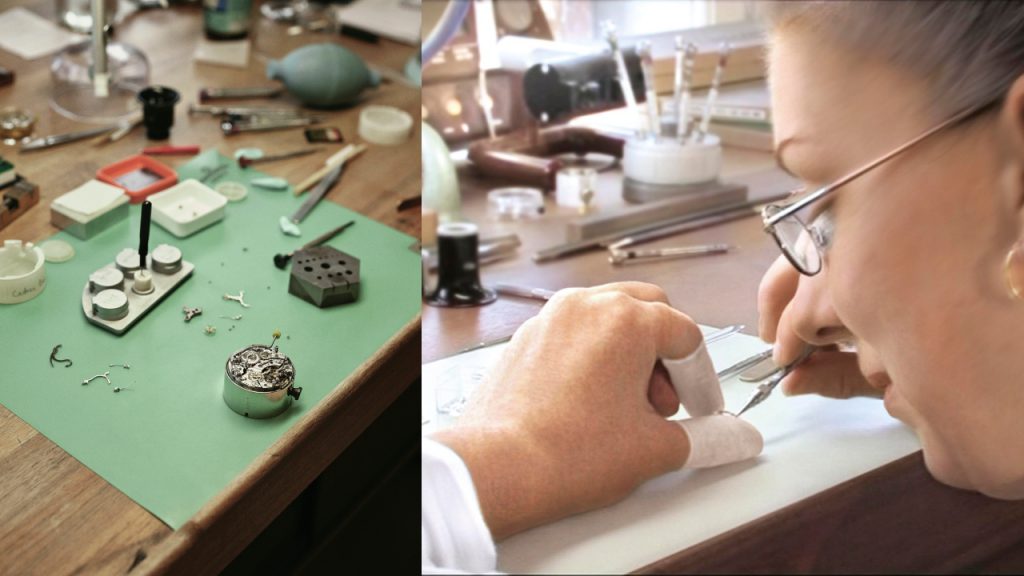 The finishing and assembly stages are done in the manner of generations before. Components, including German silver bridges and plates, are polished, sometimes using 100-year-old tools and sometimes by hand, and sometimes using the woody stems of the gentian plant, picked from nearby fields, yet another age-old technique. Movements are then painstakingly assembled and—because precision and fine adjustments are especially important to chronograph movements—typically disassembled, cleaned, and reassembled a final time.