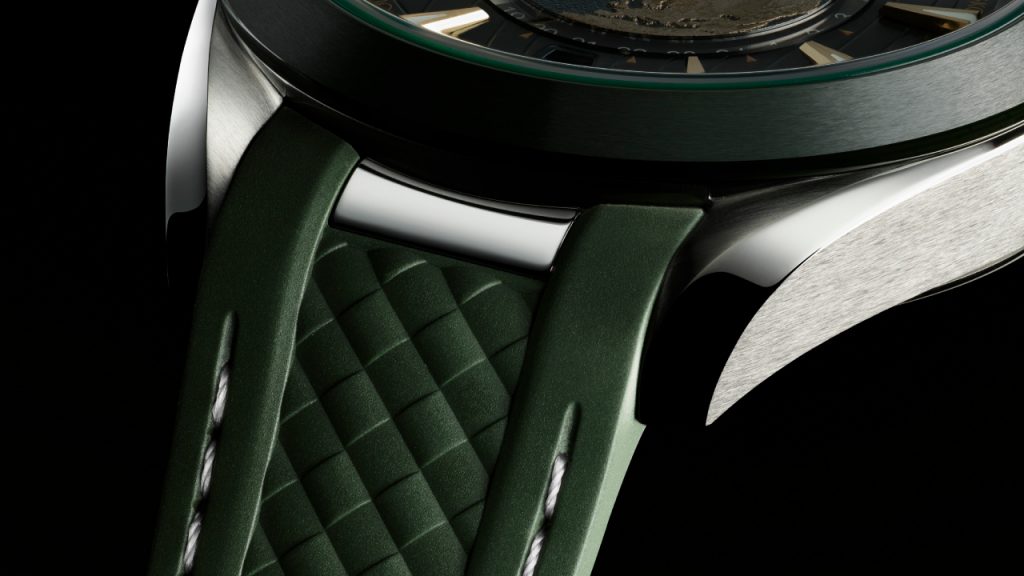 The sportiest of these would have to be the titanium version (RM51,800), which is lighter and more corrosion-resistant than its steel counterparts. The bezel is in brushed black ceramic, and its textured grey and black dial has been produced entirely via laser ablation—including the continents and colours of the world map. Only the red varnish of ‘LONDON’ at 6 o’clock is added afterwards, applied by hand. Blackened hands and indices complete the sombre aesthetic outlook along with the black rubber strap, while the markers are filled with Super-LumiNova that glows blue.