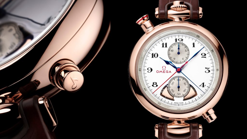 But enough about a movement. Where does this caliber fit into the greater Omega catalog? The answer is actually two different watches: The first is the Olympic 1932 Chrono Chime, which combines elements of Omega’s 19th-century minute repeater and its 1932 split-seconds chronographs. Housed in an 18-karat Sedna Gold case, it has the look of an antique pocket watch conversion/early wristwatch—but upon careful inspection, the Calibre 1932 pokes through. Take a look at 5 o’clock and you’ll notice a chime pusher protruding from the case that’s used to actuate the repeater function, while a separate pusher at 11 o’clock controls the split-seconds function.