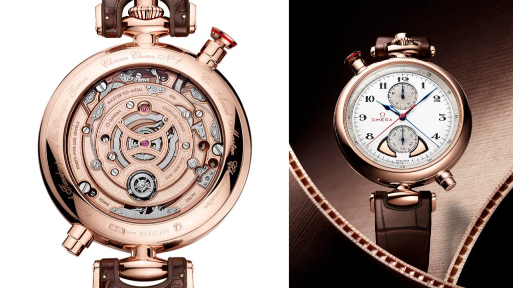 A “Grand Feu” enamel dial features a handmade, silver guilloché bezel and subdials in a unique “acoustic wave” pattern inspired by sound waves, while a 15-minute counter is situated at 12 o’clock, a 60-second counter is featured at 6 o’clock, and the watch’s dual hammers are visible in a cutout at 5 and 6 o’clock. Thoughtful touches include an 8th note motif on the chime pusher, a colour-coordinated split-seconds hand and pusher, and the elegant Arabic typography and red Omega wordmark and logo of the late 19th and early 20th century.
