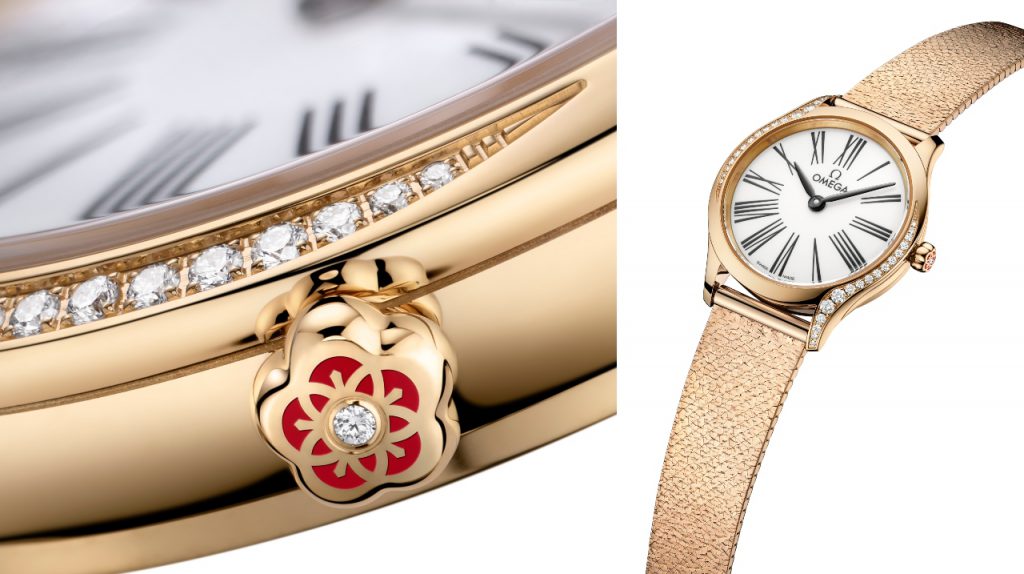 Those looking for something more luxe will gravitate to the two braceleted executions of the Mini Tresor in Moonshine Gold, Omega’s lustrous yellow gold alloy. Both have gold bracelets consisting of extremely fine, supple links that look and feel like metallic silk. The classicists will appreciate the version with white grand feu enamel dial (RM92,900), while the bold may instead opt for the textured, gold dial (RM95,700). Both have the Omega De Ville Tresor’s signature diamond curves on the bezel, as well as a red ceramic flower on the crown. All executions are equipped with quartz movements and are just 7.5mm thick.