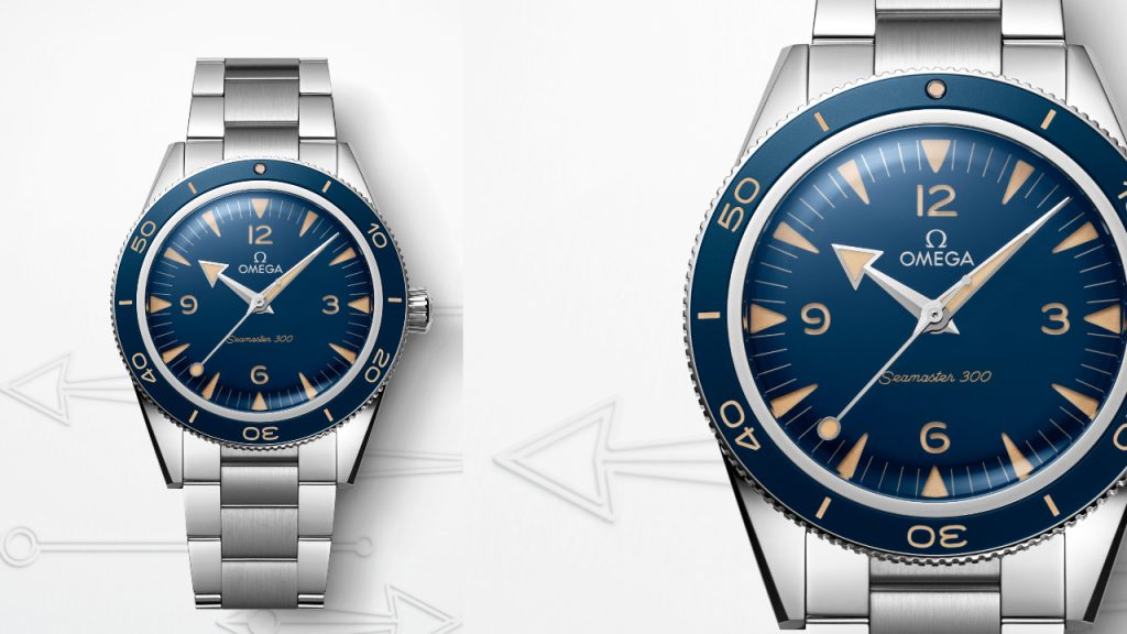 Unlike previous iterations, however, are the new sandwich dials which include a base layer of Super-LumiNova (albeit of the vintage variety) and a second plate over the top with hollowed recesses for the hour markers and numerals. The new 41 mm pieces are also slimmer than more recent editions at 14.4 mm tall. Using domed sapphire crystal glass—a popular construction of the past that was used as the solution to withstand water pressure at profound depths—made this possible. Despite a slim profile, the dial opening has been enlarged to 30.4 mm from 29.5 mm by decreasing the width of the case body and the bezel ring so that the new lineup of Seamaster 300s look larger on the wrist than the previous generation, despite the fact that the 41 mm diameter remains the same.