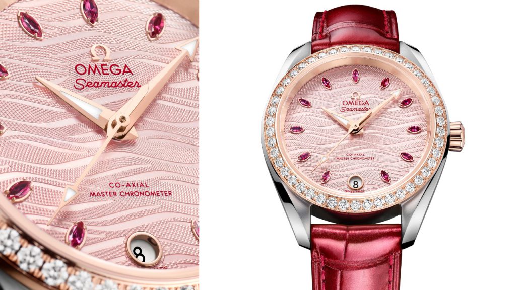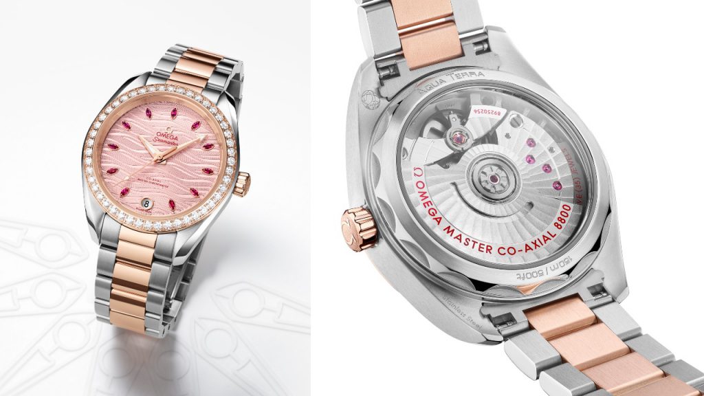 Like the new Constellation models, the Aqua Terra offering for women also comes in a new 34 mm size (with a thickness of 11.8 mm) and is offered in either stainless steel on a leather strap (US$15,800 or roughly RM65,500) or on an 18-karat Sedna gold and stainless-steel two-tone bracelet (US$20,500 or about RM85,000). But the marquee feature is the dials, which are encrusted with round diamonds on the bezel and either 11 marquise-cut diamonds or rubies for the hour markers. The gems accent new wave-embossed dials in either a saccharine cotton-candy pink, for the rubies, or a champagne hue, for the white diamonds. And while some women might appreciate the useful date window at 6 o’clock, it feels like a rather sporty touch for such dressy gem-set offerings. However, going the extra mile for its female clientele, Omega offers a view of the Co-Axial Master Chronometer Caliber 8800 through the sapphire crystal, for those who appreciate a view of the mechanics in addition to the sparkle of the gems.