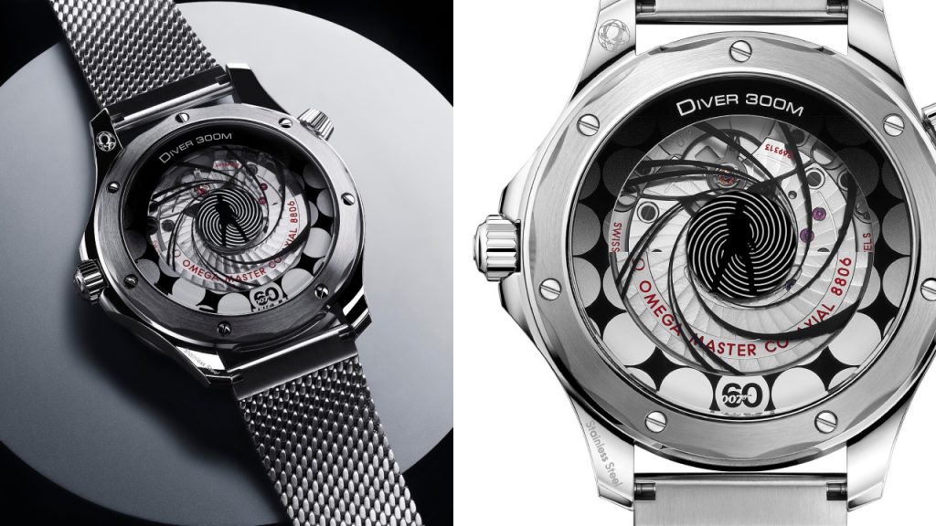 And it’s the iconic Seamaster 300 that serves as the foundation of the 60th-anniversary models. The first iteration in stainless steel is directly inspired by the watch from GoldenEye ,with nods to the film and modern upgrades. On the front, you get the classic Seamaster aesthetic with a rich blue dial and bezel made from oxalic-anodized aluminium. The dial features laser-engraved waves, and the bezel is home to a diving scale filled with white Super-LumiNova, with the traditional inverted triangle replaced by a commemorative “60.” Flip the watch over, and you’ll find an homage to the film’s opening sequence with Bond in silhouette and a spinning gun barrel design. The timepiece is complete with a mesh-style bracelet, the same as 007’s Omega watch in No Time To Die. Inside, you’ll find the brand’s Co-Axial Master Chronometer Caliber 8806.