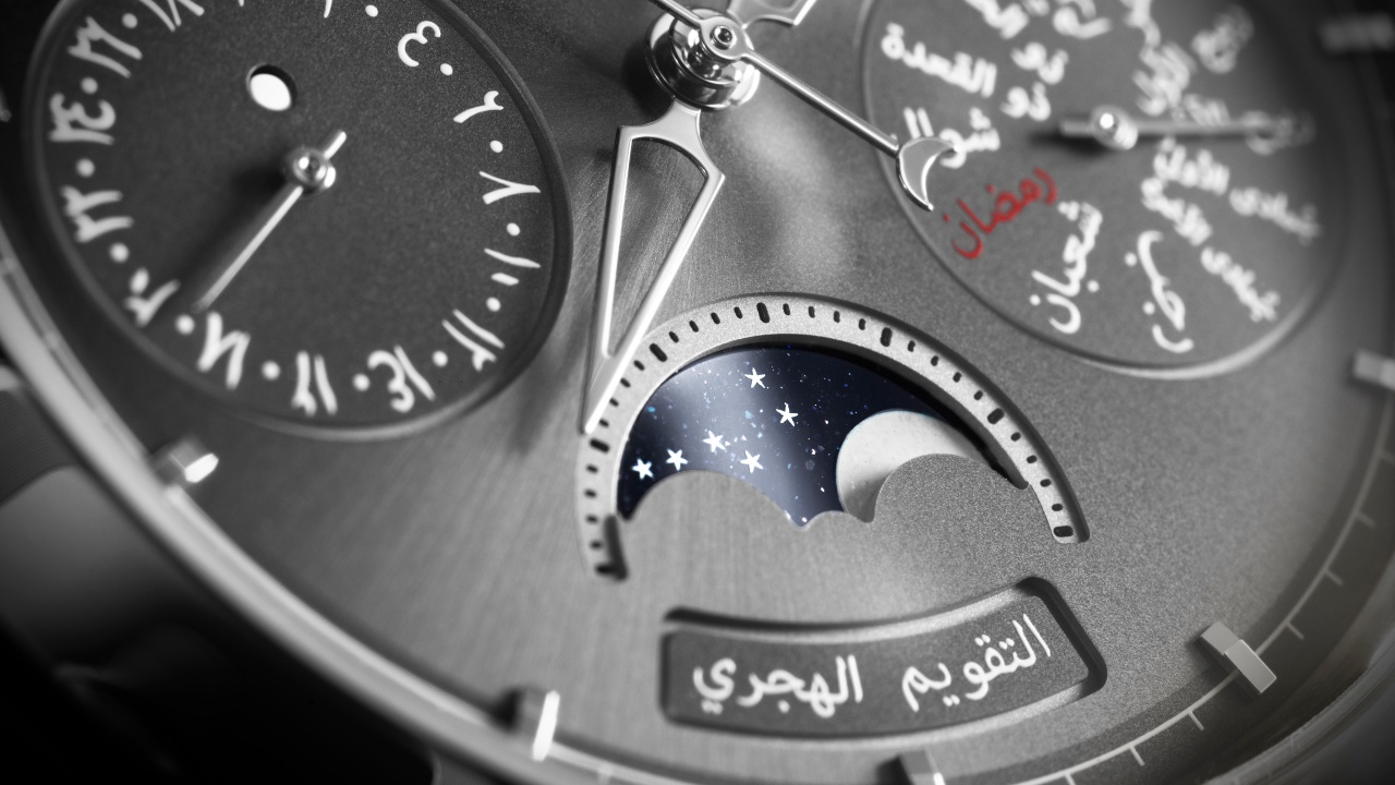 Parmigiani Fleurier has laid claim to the first Islamic perpetual calendar wristwatch with the launch of the Hijri Perpetual Calendar (RM399,800 and limited to 30 pieces). This 44.5mm timepiece cuts a dashing image with its platinum case and slate grey dial. The calendar indications are described with Arabic calligraphy, and include the date, month and year, while an aventurine moonphase provides a bit of flourish. The technology of the perpetual calendar, which tracks the 12 lunar months of the Islamic calendar, is based on a one-off patented table clock the maison created back in 2011. One quirk of this calendar is that it never needs correction—unlike a typical Gregorian perpetual calendar, where most designs of which will need its first adjustment in the year 2100.