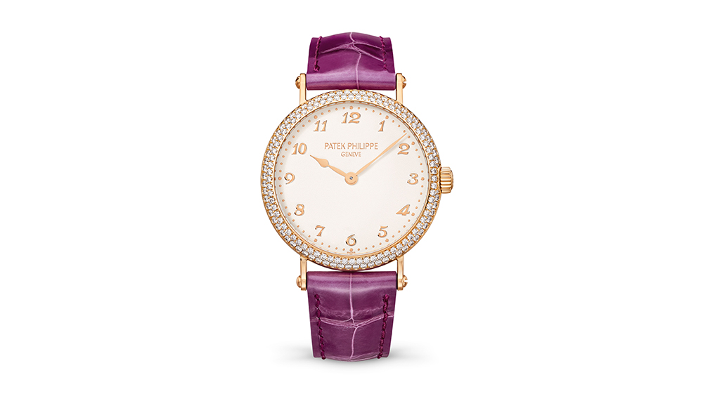 This ladies’ timepiece is diamond-set using Patek Philippe’s registered, and immensely challenging, Flamme technique – new to the horological industry. The reference displays 142 diamonds in parallel rows, mechanically-secured and precisely aligned to the contours of 18-carat rose gold Officer’s-style case. The result appears as an intricate “lace” effect, securely binding the diamonds from above, without protrusion, while allowing as much light as possible to incident upon them. Unlike traditional gemsetting methods, the fire of the diamonds is further augmented by light reflecting from their staggered apertures below.