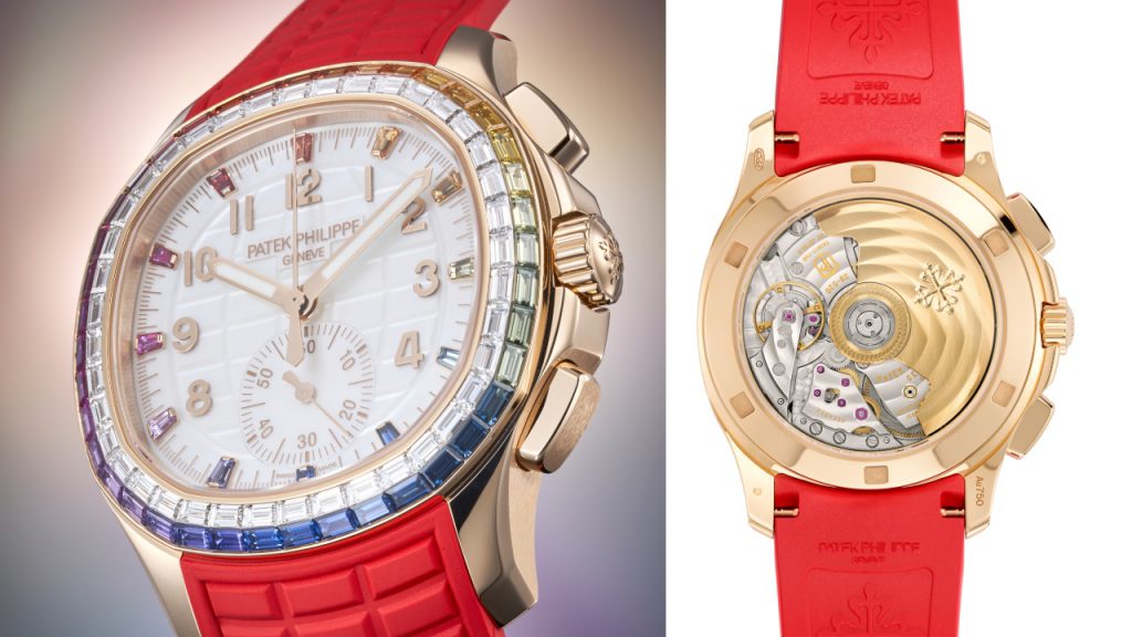 The Ref. 7968/300R-001 Aquanaut Luce Rainbow, priced at US$212,904, is the first ladies’ automatic chronograph in the Aquanaut collection, the Ref. 7968/300R-001, comes with a bezel set with graduated rainbow-coloured baguette sapphires and an inner bezel of baguette diamonds. Tapered baguette multi-coloured sapphire hour markers match the adjacent colours on the bezel. The dial is mother-of-pearl, and the strap is a rubber composite.