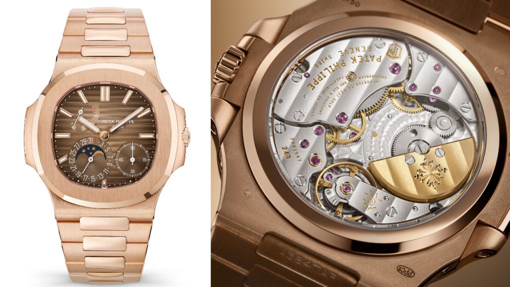 The Nautilus ref. 5712/1R-001, with analog date, moon phase and power-reserve indicator, is now in a rose-gold case and bracelet with a brown sunburst dial. An existing rose-gold version on a strap has a black dial. There are also steel and white-gold versions. The new full rose-gold piece is priced at US$82,796.